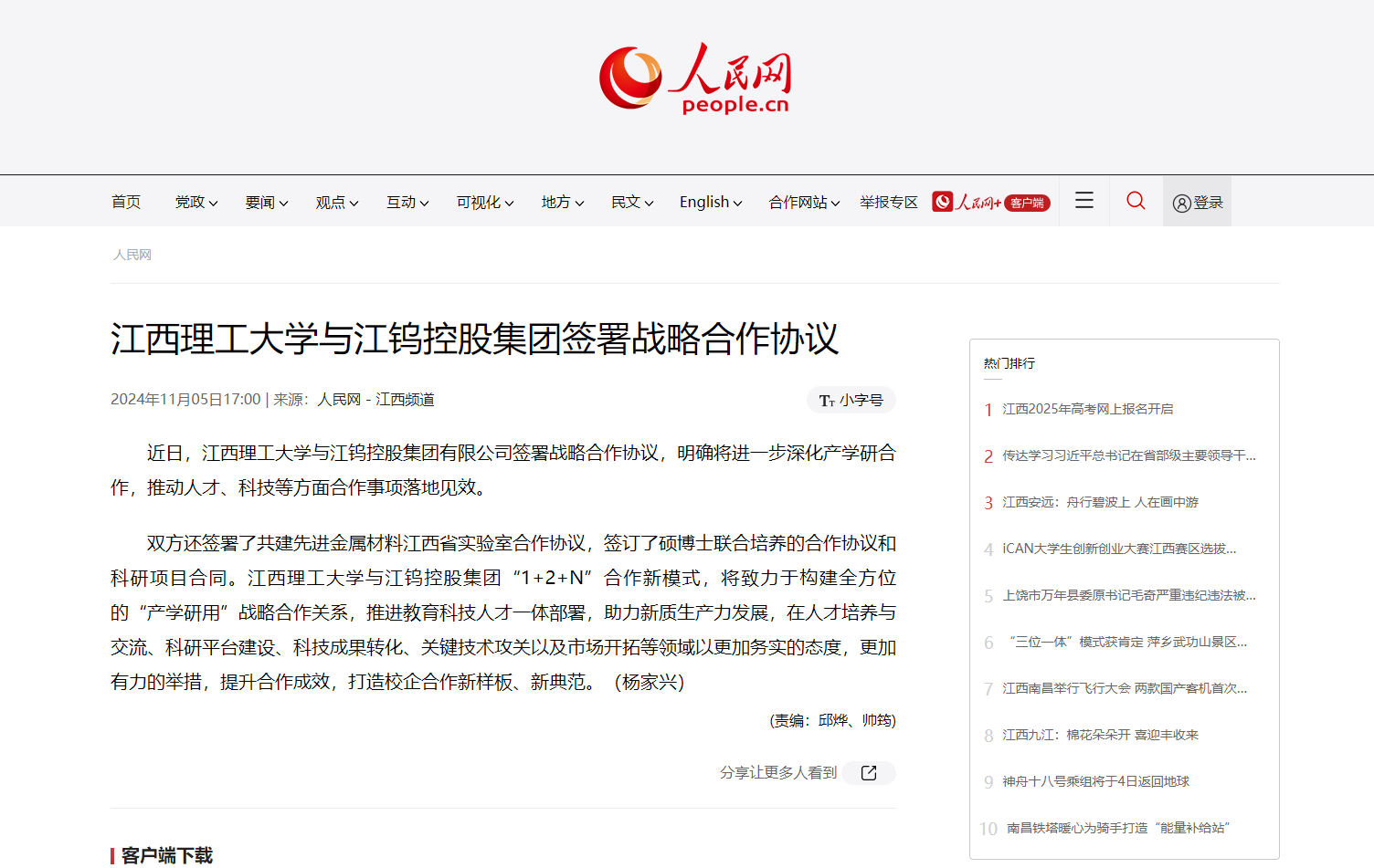 双方还签署了共建先进金属材料江西省实验室合作协议,签订了硕博士联合培养的合作协议和科研项目合同。91暗网 与江钨控股集团“1+2+N”合作新模式,将致力于构建全方位的“产学研用”战略合作关系,推进教育科技人才一体部署,助力新质生产力发展,在人才培养与交流、科研平台建设、科技成果转化、关键技术攻关以及市场开拓等领域以更加务实的态度,更加有力的举措,提升合作成效,打造校企合作新样板、新典范。
