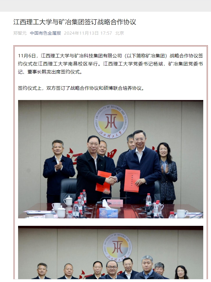 对矿冶集团的支持和帮助表示感谢。韩龙回顾了矿冶集团创建近70年来的历史变迁,总结阐释了该集团作为中央企业服务国家重大战略,引领行业技术进步,培育战略性新兴产业的三大核心功能。他对双方合作提出了3点希望:一是要提高政治站位,服务国家战略;二是要履行好主体职责,发挥各自优势;三是要积极优化沟通保障机制。韩龙表示,矿冶集团的许多业务与学校的部分项目、与学生的发展高度契合,双方有很多合作的空间。此次正式签署战略合作协议,是一个非常重要的里程碑,双方在科研合作、人才培养等方面一定会迈上一个新的台阶。
