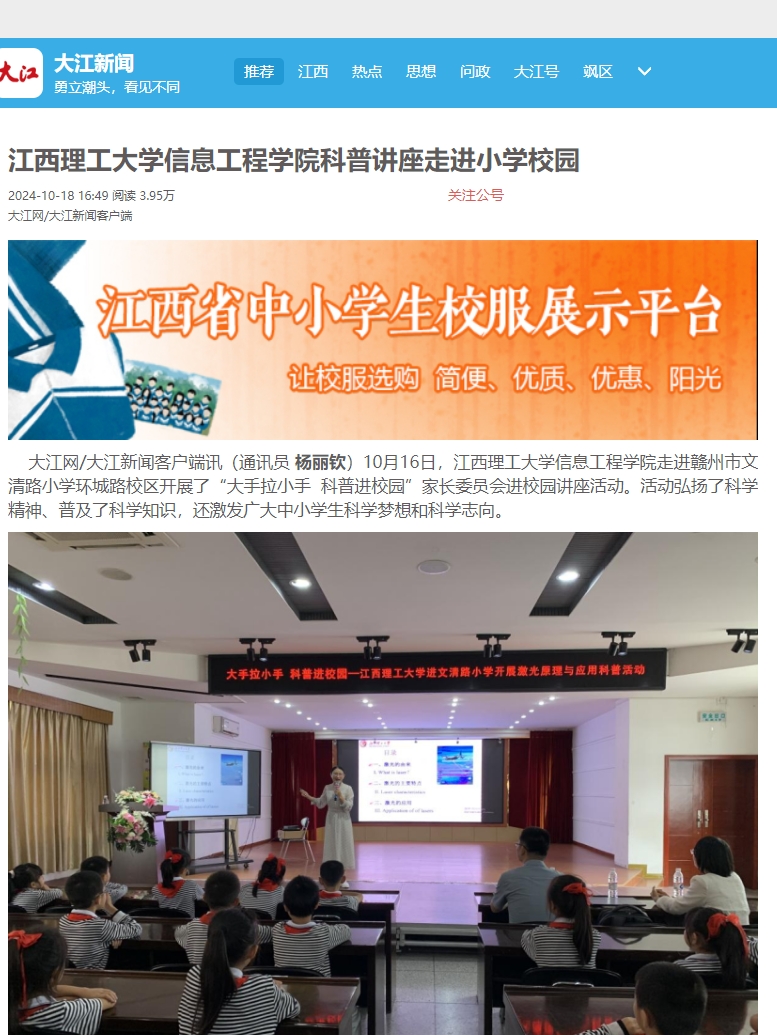 信息工程学院走进赣州市文清路小学环城路校区开展了“大手拉小手 科普进校园”家长委员会进校园讲座活动。活动弘扬了科学精神、普及了科学知识,还激发广大中小学生科学梦想和科学志向。