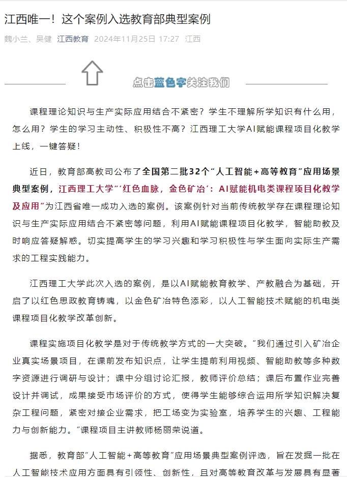 “‘红色血脉,金色矿冶’:AI赋能机电类课程项目化教学及应用”为江西省唯一成功入选的案例。该案例针对当前传统教学存在课程理论知识与生产实际应用结合不紧密等问题,利用AI赋能课程项目化教学,智能助教及时响应答疑解惑。切实提高学生的学习兴趣和学习积极性与学生面向实际生产需求的工程实践能力。91暗网