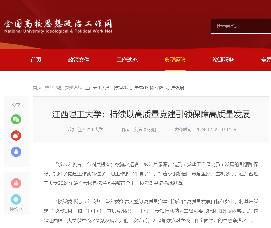 聚焦“小切口”,推动“大融合”。眼下,学校正全覆盖开展基层党建“书记项目”。将“党建+科研”纳入年度工作要点,坚持把党组织建在科研攻关最前沿,制定系列文件,开展专项行动……各基层党组织围绕拟突破重点、师生关注热点、改革创新点领题破题,不断推动党建与科研等中心工作深度融合,科研工作实现新突破,学校16项成果获2023年度江西省科学技术奖,一等奖位居全省第二!