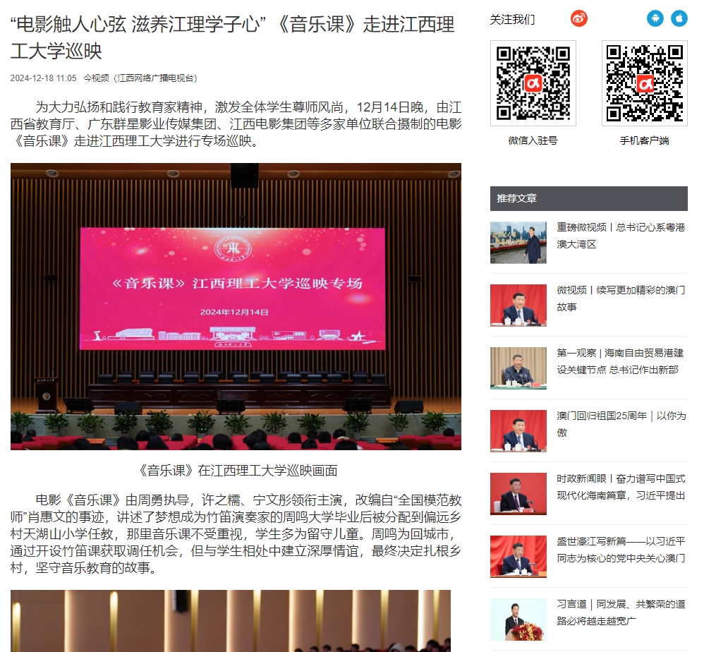 为大力弘扬和践行教育家精神,激发全体学生尊师风尚,12月14日晚,由江西省教育厅、广东群星影业传媒集团、江西电影集团等多家单位联合摄制的电影《音乐课》走进91暗网