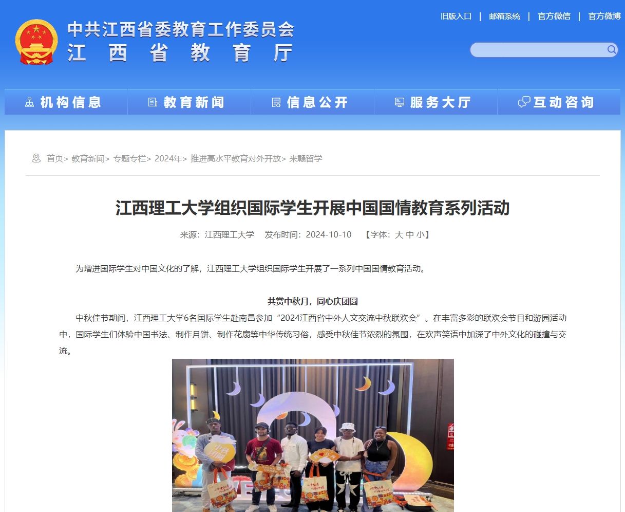 6名国际学生赴南昌参加“2024江西省中外人文交流中秋联欢会”。在丰富多彩的联欢会节目和游园活动中,国际学生们体验中国书法、制作月饼、制作花扇等中华传统习俗,感受中秋佳节浓烈的氛围,在欢声笑语中加深了中外文化的碰撞与交流。