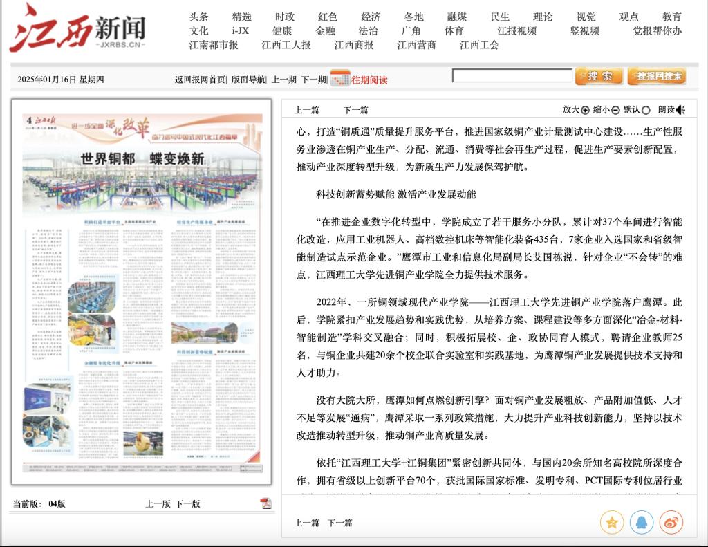 先进铜产业学院落户鹰潭。此后,学院紧扣产业发展趋势和实践优势,从培养方案、课程建设等多方面深化“冶金-材料-智能制造”学科交叉融合;同时,积极拓展校、企、政协同育人模式,聘请企业教师25名,与铜企业共建20余个校企联合实验室和实践基地,为鹰潭铜产业发展提供技术支持和人才助力。