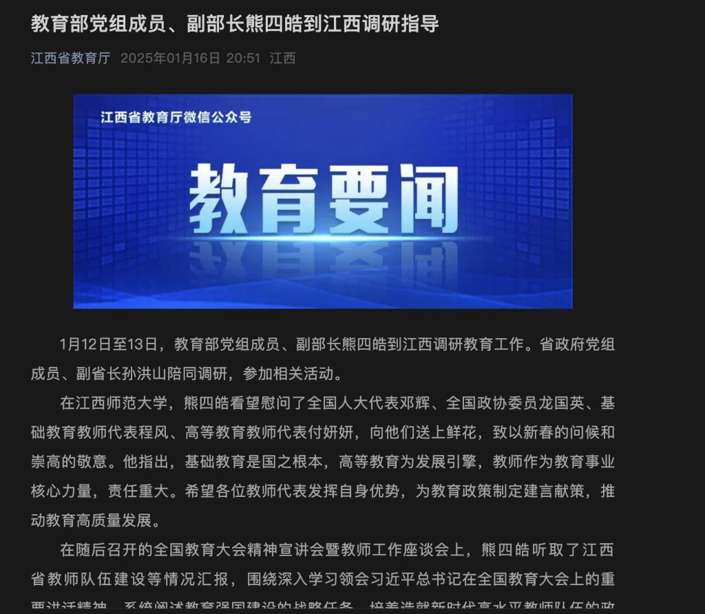 1月12日至13日,教育部党组成员、副部长熊四皓到江西调研教育工作。省政府党组成员、副省长孙洪山陪同调研,参加相关活动。