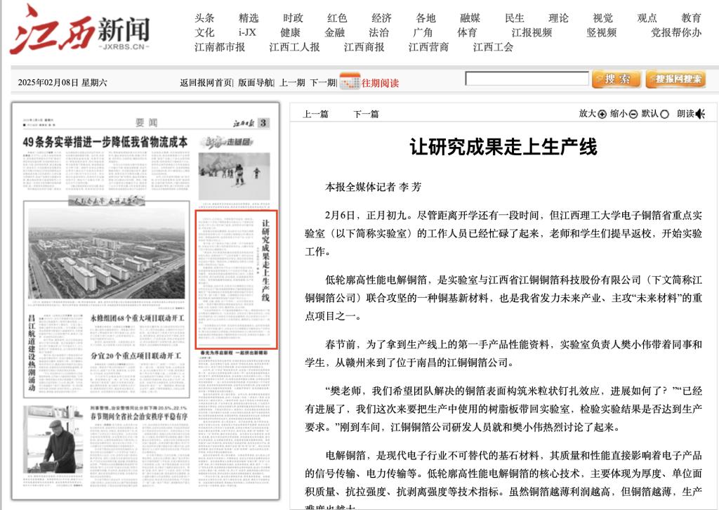 “虽然寒假还在忙科研,但是研究成果能落地转化,是件很幸福的事。”樊小伟介绍道,眼下,实验室正与江铜铜箔公司继续深化产学研合作,聚力攻关2024年江西省重大科技成果熟化与工程化研究项目——高性能5G通信用低轮廓电子铜箔研制及中试应用,在现有技术基础上,开展技术深化工作,实现5G铜箔市场新应用。