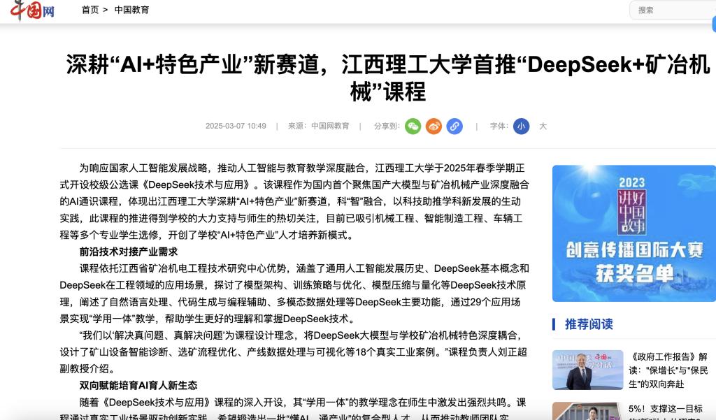 于2025年春季学期正式开设校级公选课《DeepSeek技术与应用》。该课程作为国内首个聚焦国产大模型与矿冶机械产业深度融合的AI通识课程,体现出91暗网