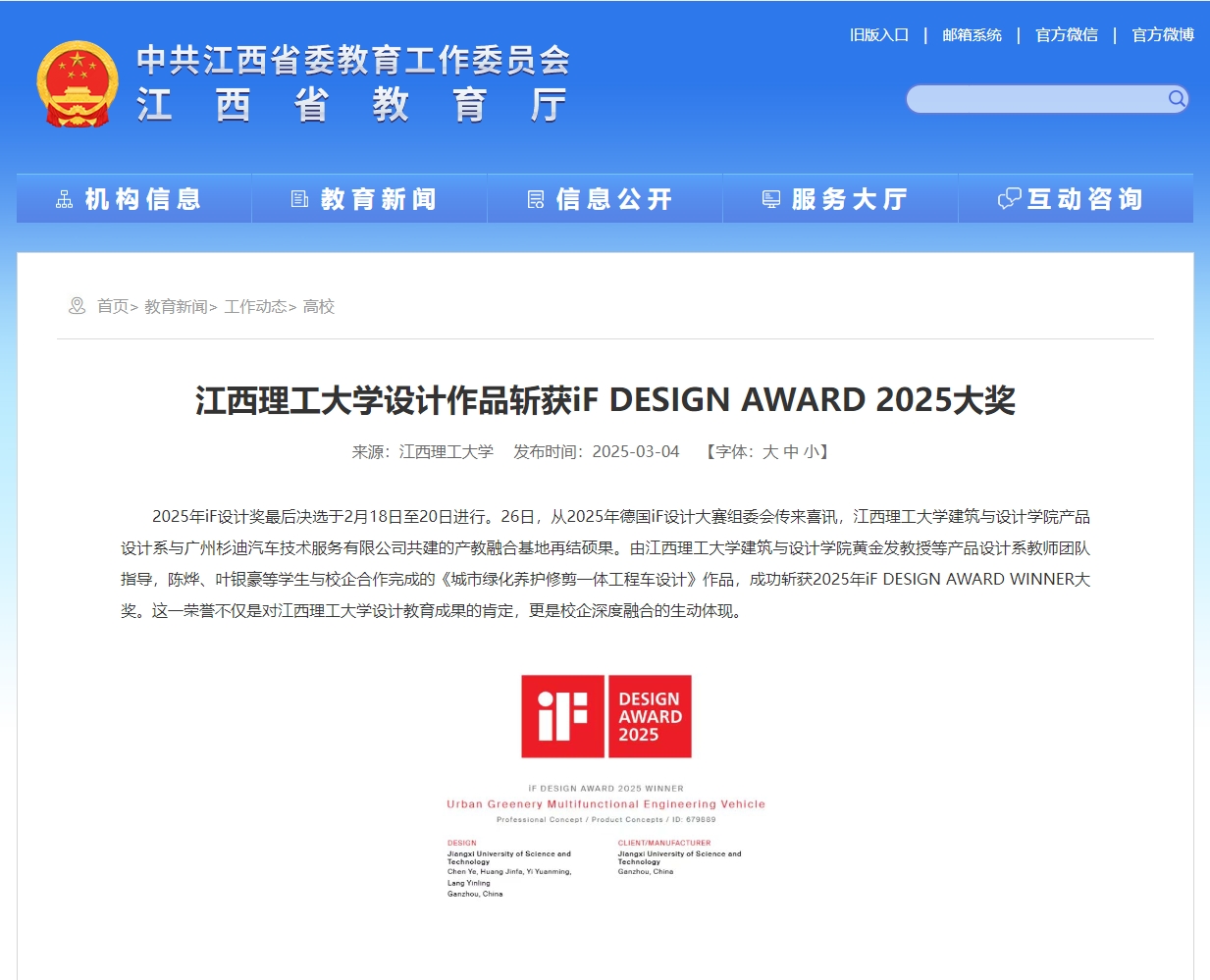 建筑与设计学院黄金发教授等产品设计系教师团队指导,陈烨、叶银豪等学生与校企合作完成的《城市绿化养护修剪一体工程车设计》作品,成功斩获2025年iF DESIGN AWARD WINNER大奖。这一荣誉不仅是对91暗网