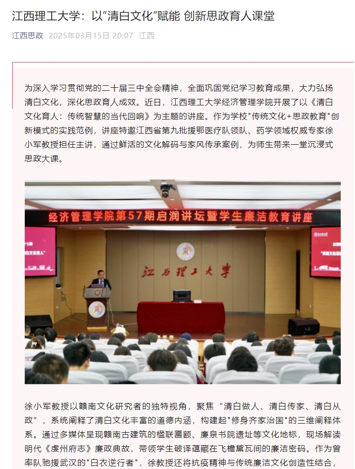 开展了以《清白文化育人:传统智慧的当代回响》为主题的讲座。作为学校"传统文化+思政教育"创新模式的实践范例,讲座特邀江西省第九批援鄂医疗队领队、药学领域权威专家徐小军教授担任主讲,通过鲜活的文化解码与家风传承案例,为师生带来一堂沉浸式思政大课。