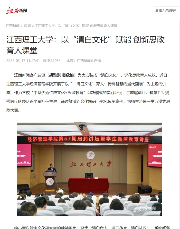 开展了以“‘清白文化’育人:传统智慧的当代回响”为主题的讲座。作为学校“中华优秀传统文化+思政教育”创新模式的实践范例,讲座邀请江西省第九批援鄂医疗队领队徐小军担任主讲,通过鲜活的文化解码与家风传承案例,为师生带来一堂沉浸式思政大课。