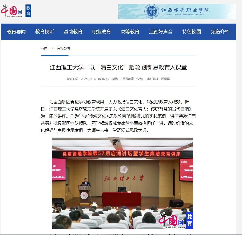 开展了以《清白文化育人:传统智慧的当代回响》为主题的讲座。作为学校"传统文化+思政教育"创新模式的实践范例,讲座特邀江西省第九批援鄂医疗队领队、药学领域权威专家徐小军教授担任主讲,通过鲜活的文化解码与家风传承案例,为师生带来一堂沉浸式思政大课。
