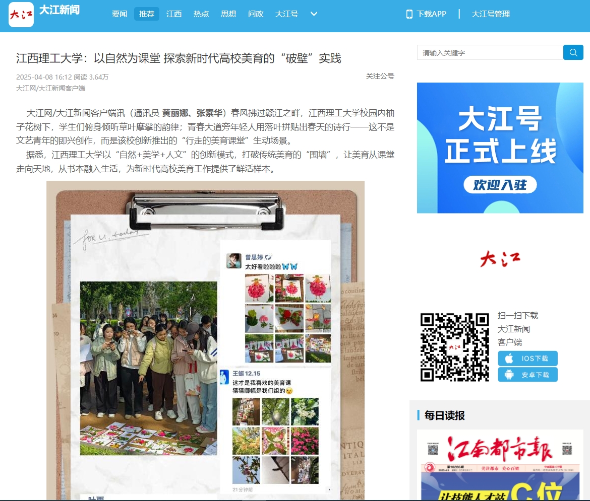 放眼望去,这片红土地上的美育实践,恰似赣江春潮,奔涌向前。在这里,美育不再是锦上添花的点缀,而是立德树人的重要支点;美育课堂不再囿于方寸讲台,而是延伸到了天地之间。这场关于“美”的深刻变革,正在为培养德智体美劳全面发展的时代新人注入澎湃动能。