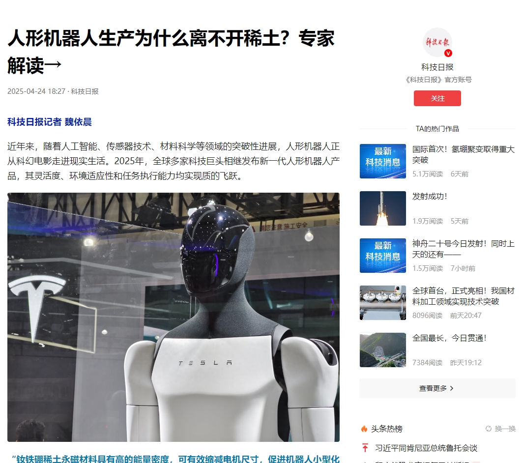 据媒体报道,特斯拉公司首席执行官埃隆·马斯克4月22日表示,其“擎天柱”人形机器人的生产受到了中国对稀土磁体出口限制的影响。为此,他表示,特斯拉正在积极申请中国稀土永磁材料的出口许可。