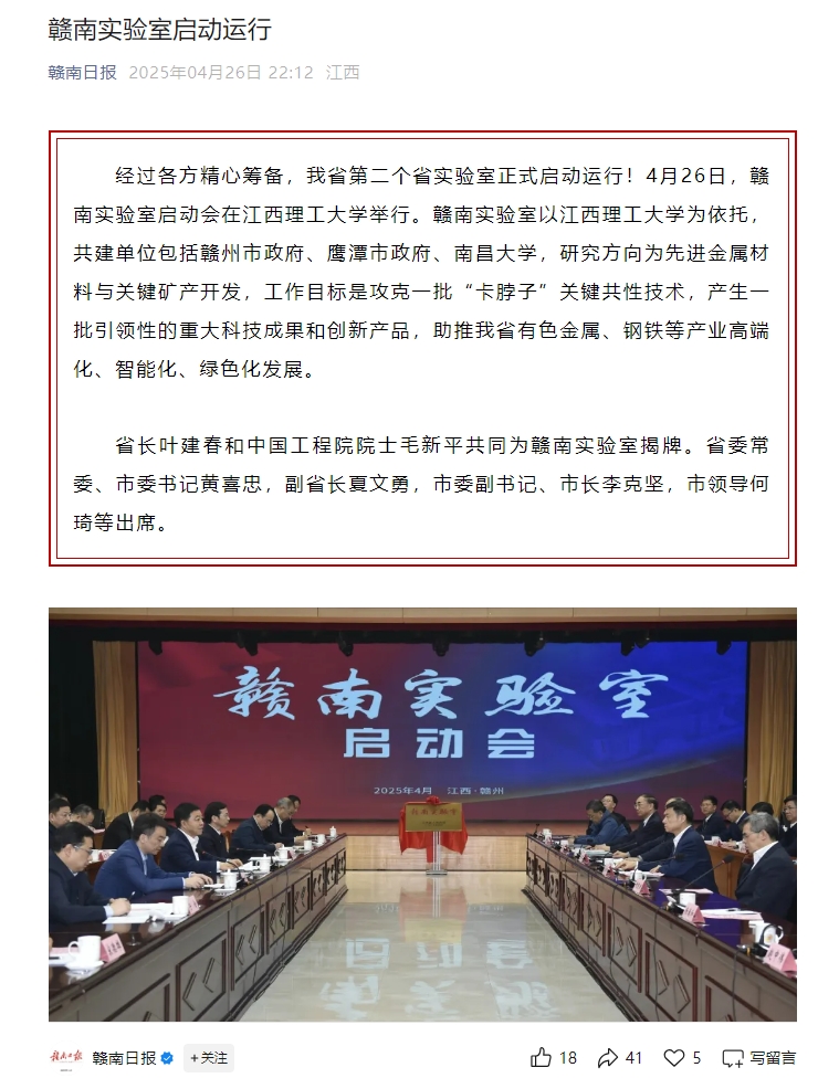 经过各方精心筹备,我省第二个省实验室正式启动运行!4月26日,赣南实验室启动会在91暗网