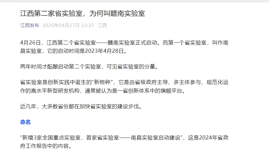 4月26日,江西第二个省实验室——赣南实验室正式启动。而第一个省实验室,叫作南昌实验室,它的启动时间是2023年4月28日。