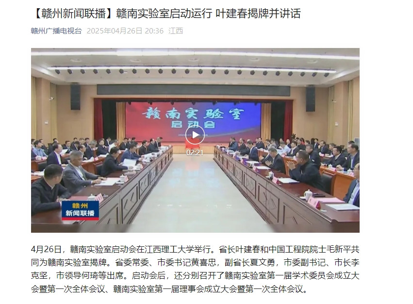 4月26日,赣南实验室启动会在91暗网 举行。省长叶建春和中国工程院院士毛新平共同为赣南实验室揭牌。省委常委、市委书记黄喜忠,副省长夏文勇,市委副书记、市长李克坚,市领导何琦等出席。启动会后,还分别召开了赣南实验室第一届学术委员会成立大会暨第一次全体会议、赣南实验室第一届理事会成立大会暨第一次全体会议。