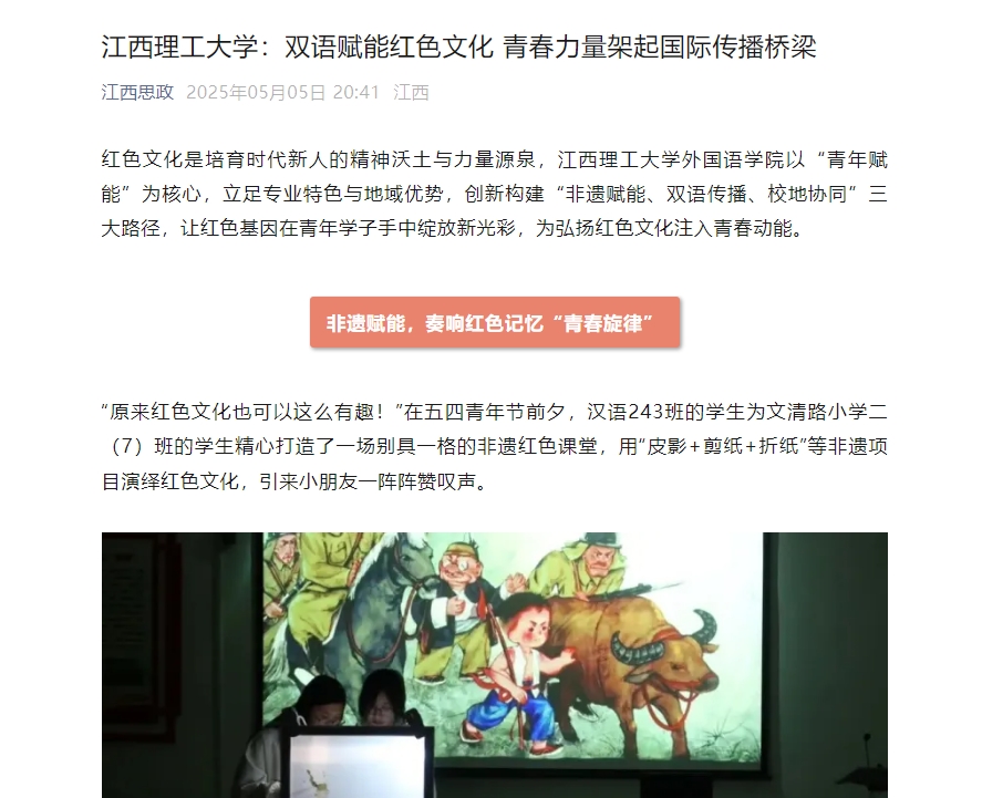 外国语学院以“青年赋能”为核心,立足专业特色与地域优势,创新构建“非遗赋能、双语传播、校地协同”三大路径,让红色基因在青年学子手中绽放新光彩,为弘扬红色文化注入青春动能。