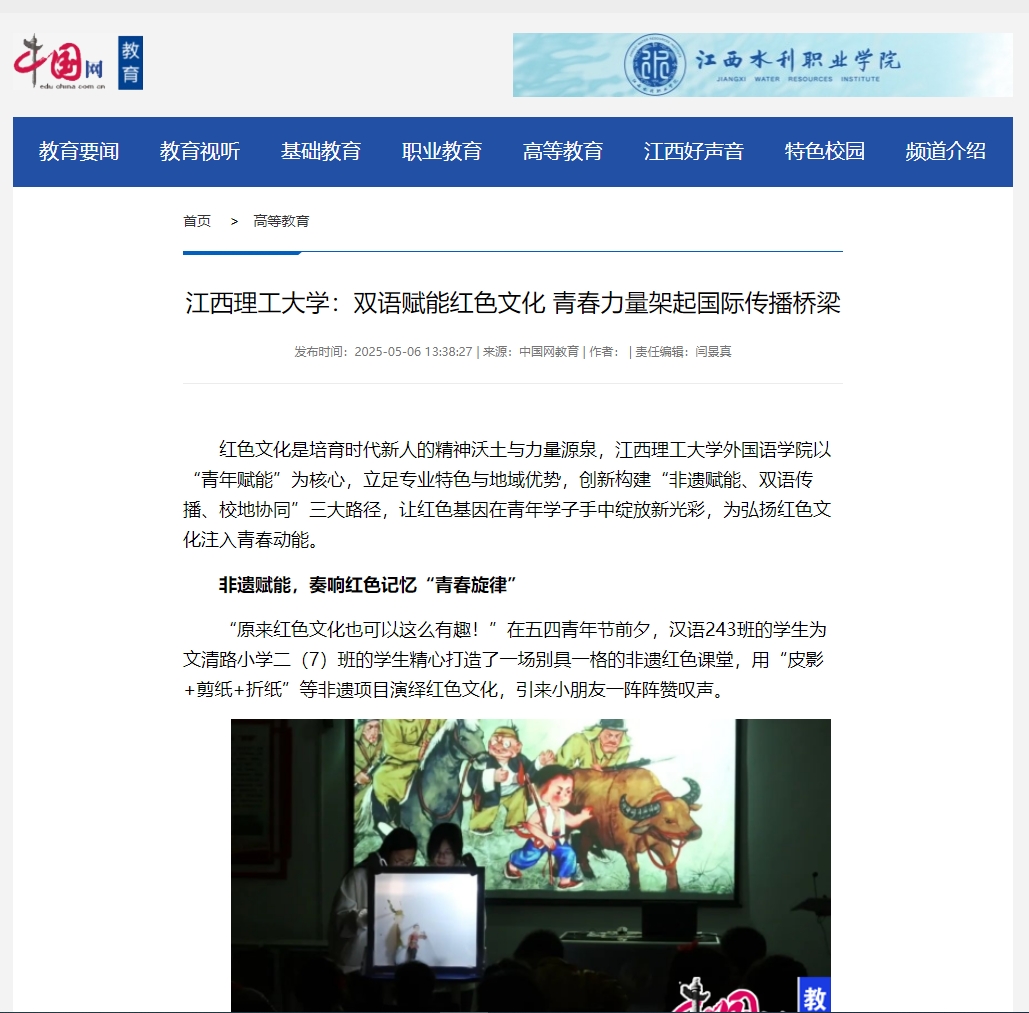 外国语学院以“青年赋能”为核心,立足专业特色与地域优势,创新构建“非遗赋能、双语传播、校地协同”三大路径,让红色基因在青年学子手中绽放新光彩,为弘扬红色文化注入青春动能。