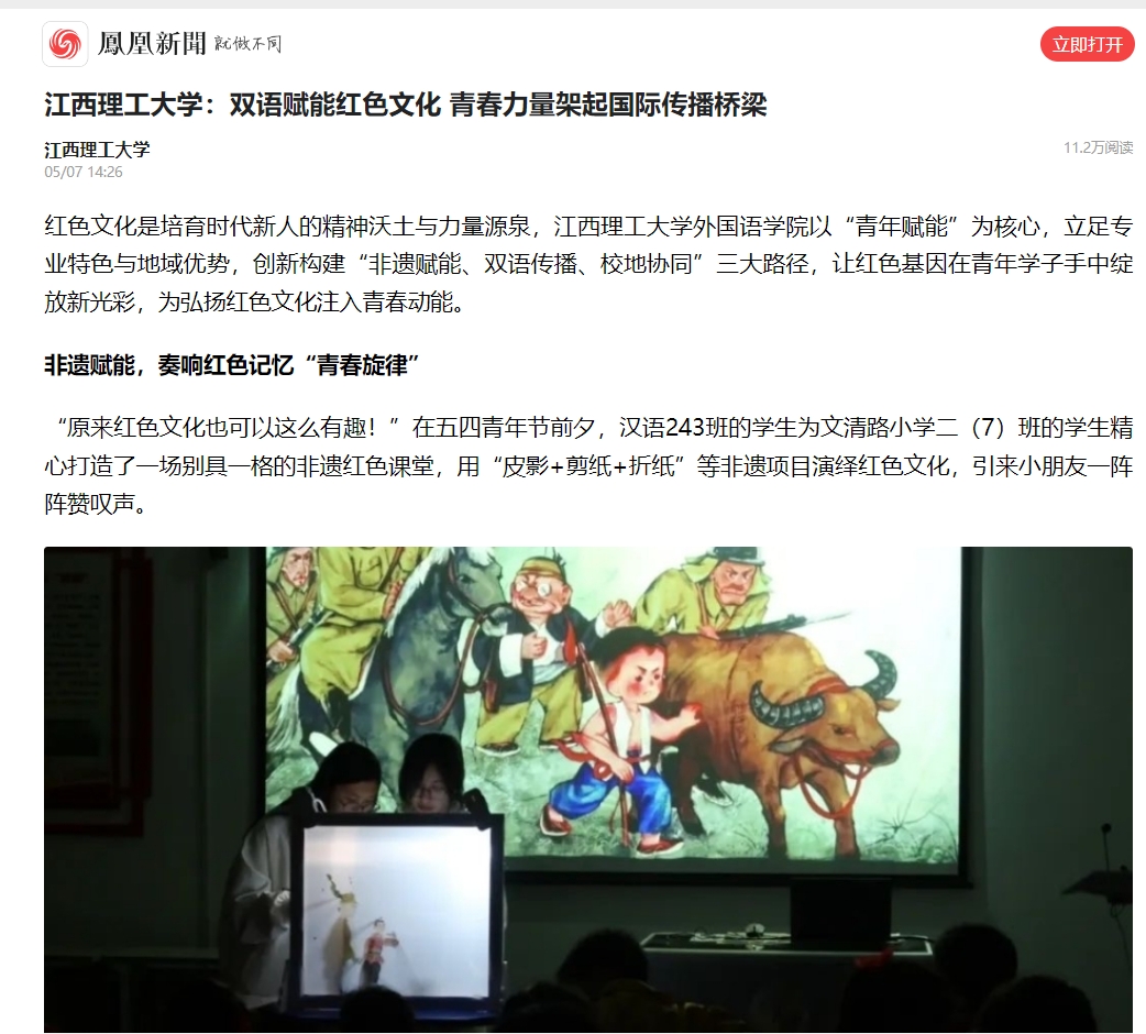 外国语学院以“青年赋能”为核心,立足专业特色与地域优势,创新构建“非遗赋能、双语传播、校地协同”三大路径,让红色基因在青年学子手中绽放新光彩,为弘扬红色文化注入青春动能。