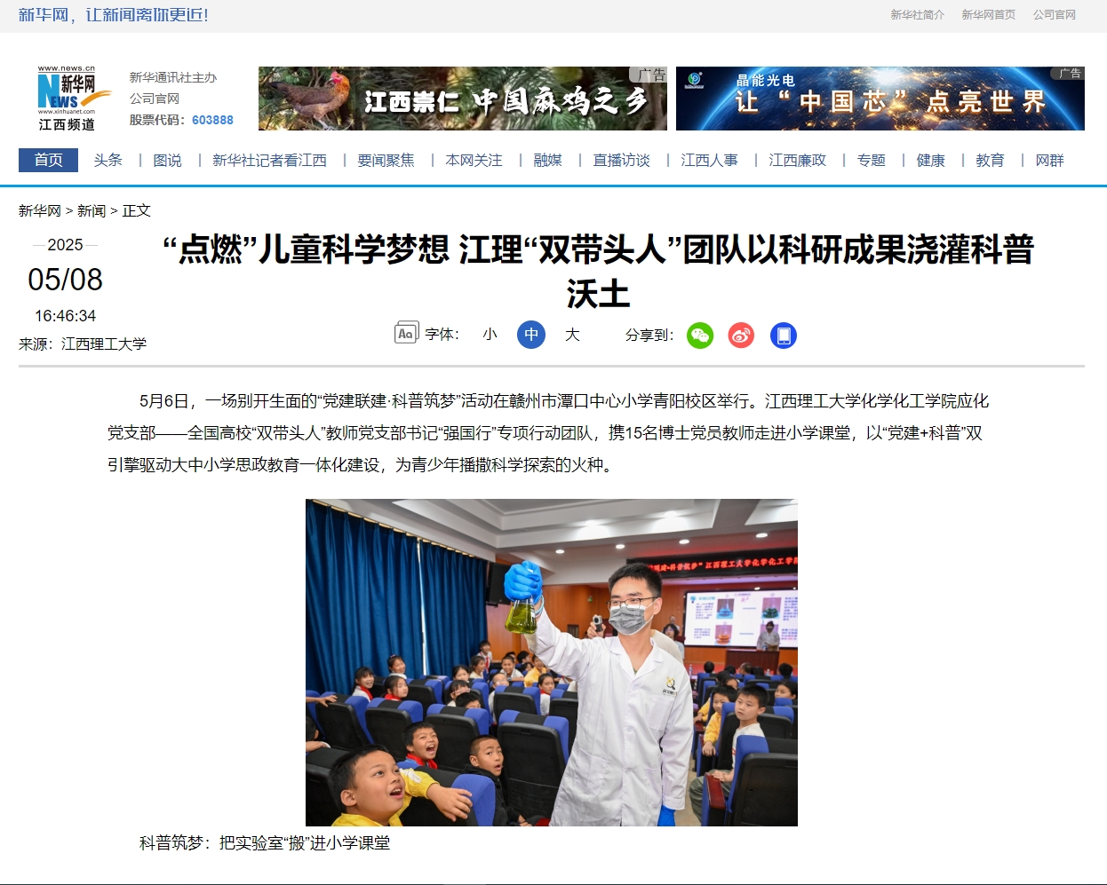 这场“党建联建·科普筑梦”活动,不仅是高等教育与基础教育的一次破壁对话,更彰显了新时代党建工作的创新维度——以科学家精神筑牢党性根基,以科研成果服务社会需求,让党旗在科技报国与教育强国的交汇点上高高飘扬。正如刘遂军所言:“每个党建‘双带头人’都应成为‘双育人’先锋,在孩子们、青年朋友们心中种下爱党报国的基因,长出创新自信的翅膀。”(陈琰、邱凯强、王熙、陈佳奕、钟屹之)