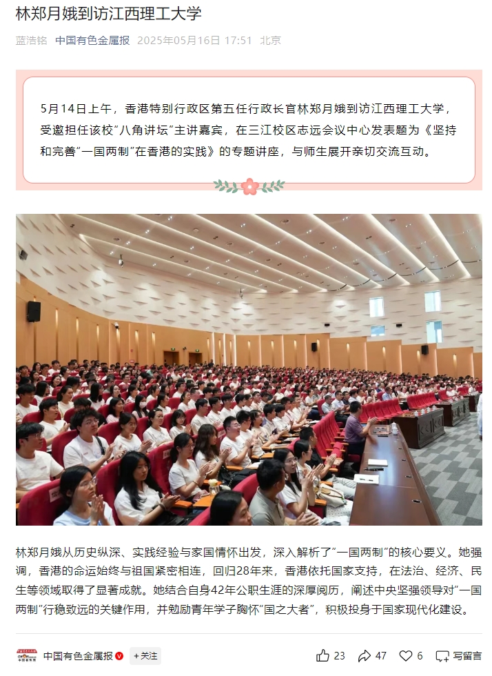 林郑月娥的专题讲座立意深远、内容丰富,既是一场学术讲座,更是一堂生动的国情教育课,有效增强了与会师生对“一国两制”的信心和决心。讲座落幕之际,现场响起经久不息的热烈掌声。多位师生表示,林郑月娥在应对国家安全挑战以及带领香港成功渡过疫情难关等过程中所展现出的非凡勇气、坚韧担当以及“功成不必在我,功成必定有我”的崇高精神,为众人树立起光辉的榜样。