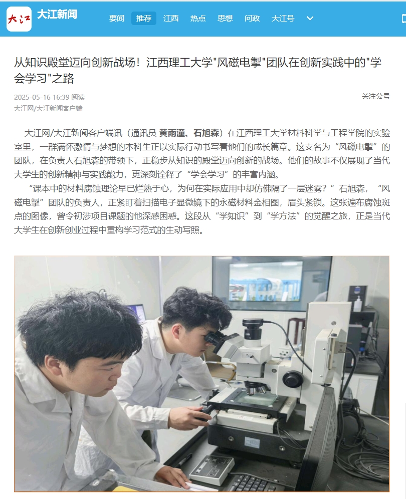 “课本中的材料腐蚀理论早已烂熟于心,为何在实际应用中却仿佛隔了一层迷雾?”石旭森,“风磁电掣”团队的负责人,正紧盯着扫描电子显微镜下的永磁材料金相图,眉头紧锁。这张遍布腐蚀斑点的图像,曾令初涉项目课题的他深感困惑。这段从“学知识”到“学方法”的觉醒之旅,正是当代大学生在创新创业过程中重构学习范式的生动写照。