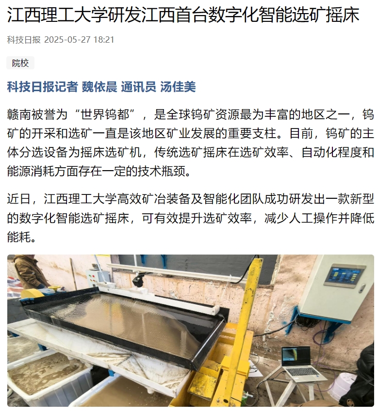 目前,新型数字化智能选矿摇床已经在实验室和矿山等场景进行测试,表现良好、性能指标稳定,已获批国家发明专利一项,发表相关SCI论文3篇。团队指导老师刘惠中教授表示,这一创新成果不仅为矿业装备行业带来了更高效、更智能的解决方案,也为国内外选矿产业提供了技术参考,推动了矿业行业向绿色、高效、智能化方向发展。