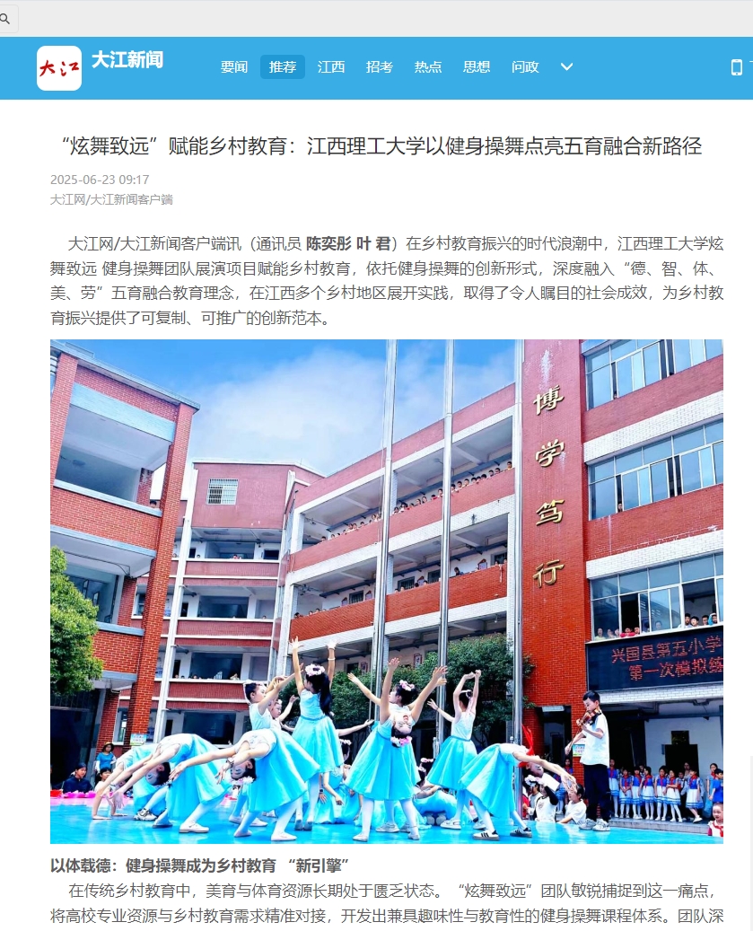 炫舞致远 健身操舞团队展演项目赋能乡村教育,依托健身操舞的创新形式,深度融入“德、智、体、美、劳”五育融合教育理念,在江西多个乡村地区展开实践,取得了令人瞩目的社会成效,为乡村教育振兴提供了可复制、可推广的创新范本。