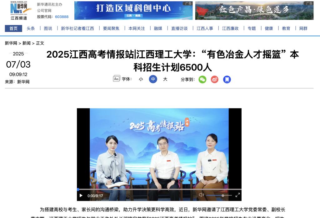 招生与就业工作处处长邓晓宇做客“2025江西高考情报站”,围绕2025年学校招生专业设置变化、招生计划、人才培养特色等方面,回答考生及家长们的关切问题,介绍相关情况。