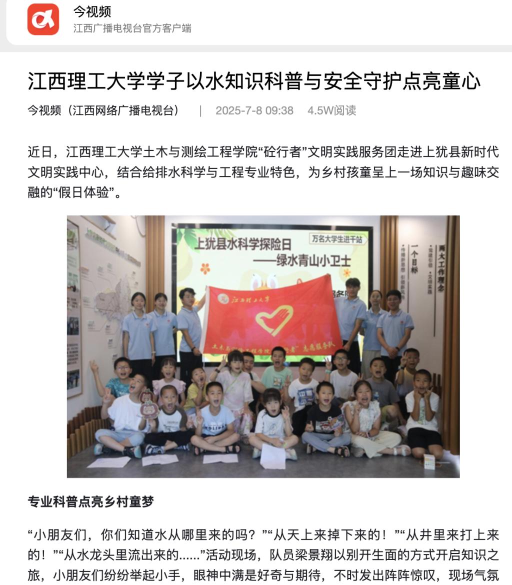 土木与测绘工程学院“砼行者”文明实践服务团走进上犹县新时代文明实践中心,结合给排水科学与工程专业特色,为乡村孩童呈上一场知识与趣味交融的“假日体验”。