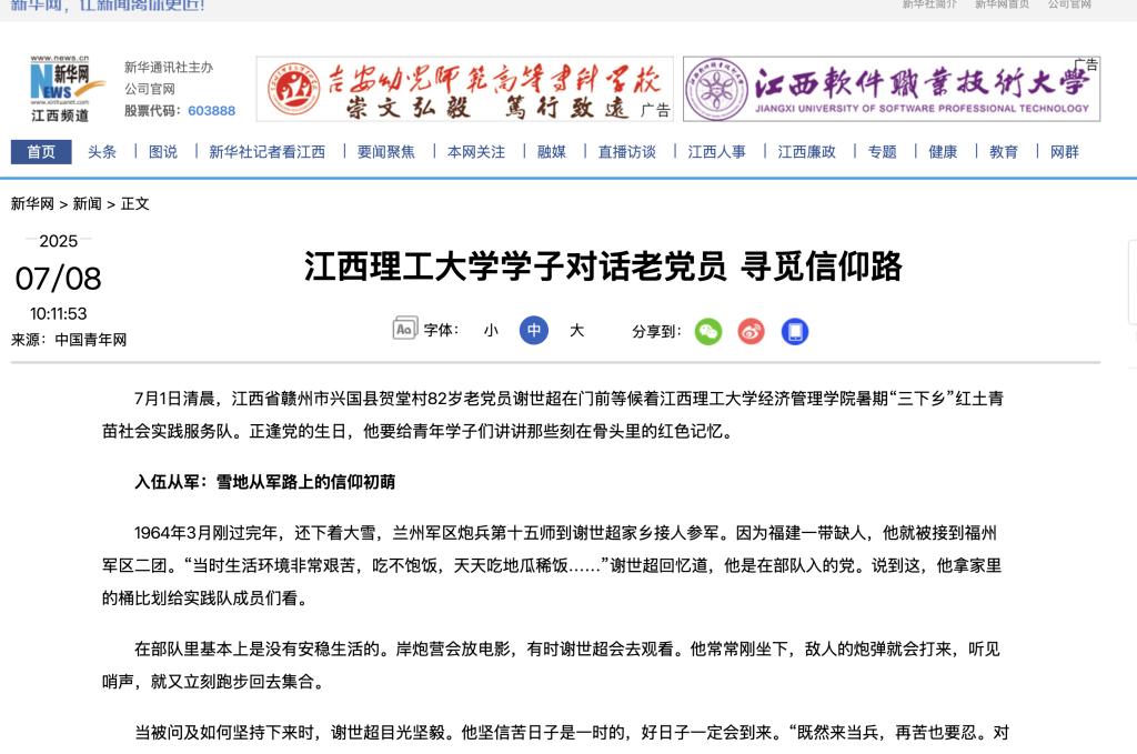 暑期“三下乡”红土青苗社会实践服务队。正逢党的生日,他要给青年学子们讲讲那些刻在骨头里的红色记忆。