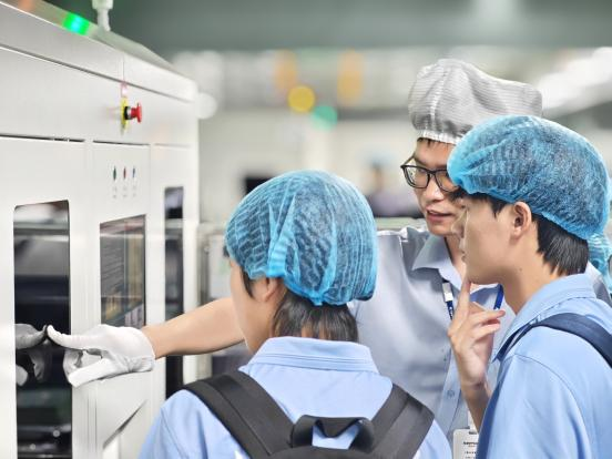 在景旺电子科技(赣州)有限公司的现代化车间里,智能化生产的蓬勃活力扑面而来。灵巧的机械臂精准完成各项操作,高效的AGV小车沿设定路线灵活穿梭,共同构建起一套流畅高效的自动化物流体系。学子们系统观摩了从精密基板制造到多层压合的全套生产工艺流程,直观了解了“数智赋能”给制造业转型升级带来的深刻变革。