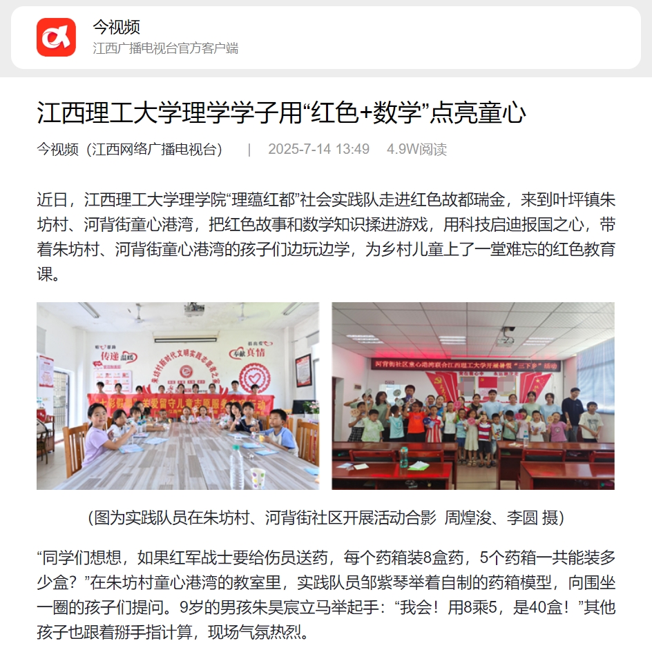 理学院“理蕴红都”社会实践队走进红色故都瑞金,来到叶坪镇朱坊村、河背街童心港湾,把红色故事和数学知识揉进游戏,用科技启迪报国之心,带着朱坊村、河背街童心港湾的孩子们边玩边学,为乡村儿童上了一堂难忘的红色教育课。