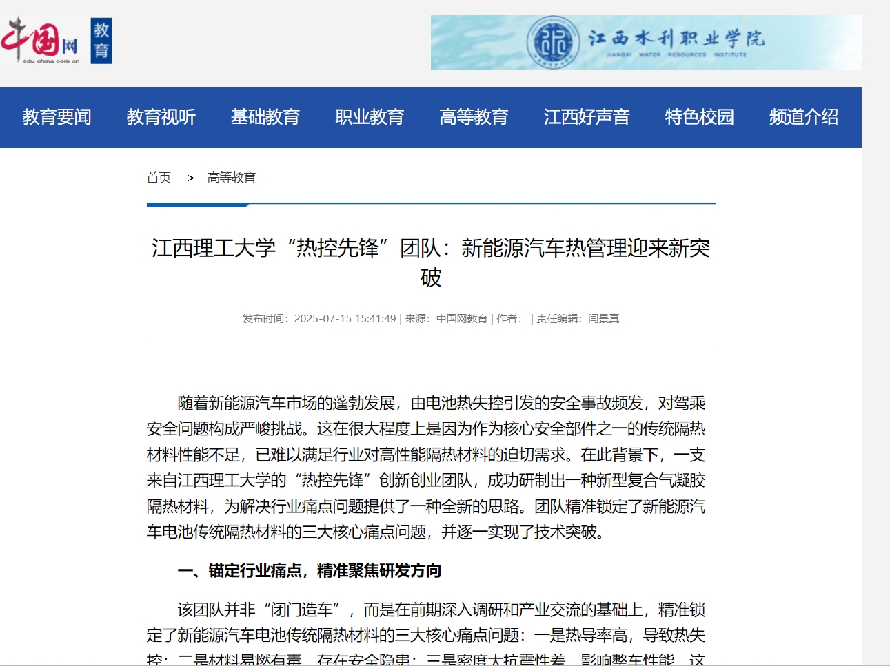 首批“科创中国”创新基地的支持下,学校为“热控先锋”团队提供了近100平方米的创业孵化场地,为此次技术攻关提供了坚实的支撑。团队成功研发的新型复合气凝胶隔热材料,不仅展现了卓越的科研实力,也为新能源汽车的安全未来贡献了“江理”力量。“这次的研究成果仅仅是一个起点,未来,我们希望这项技术能真正走向市场,不仅为新能源汽车提供更可靠的安全守护,也能在航空航天、节能建筑等领域得到应用,在更广阔的舞台上展现中国新一代科研工作者的潜力与担当。”该团队指导教师张思钊博士在谈及此次进展时表示。(文/余帅、宋彤图/戴磊)