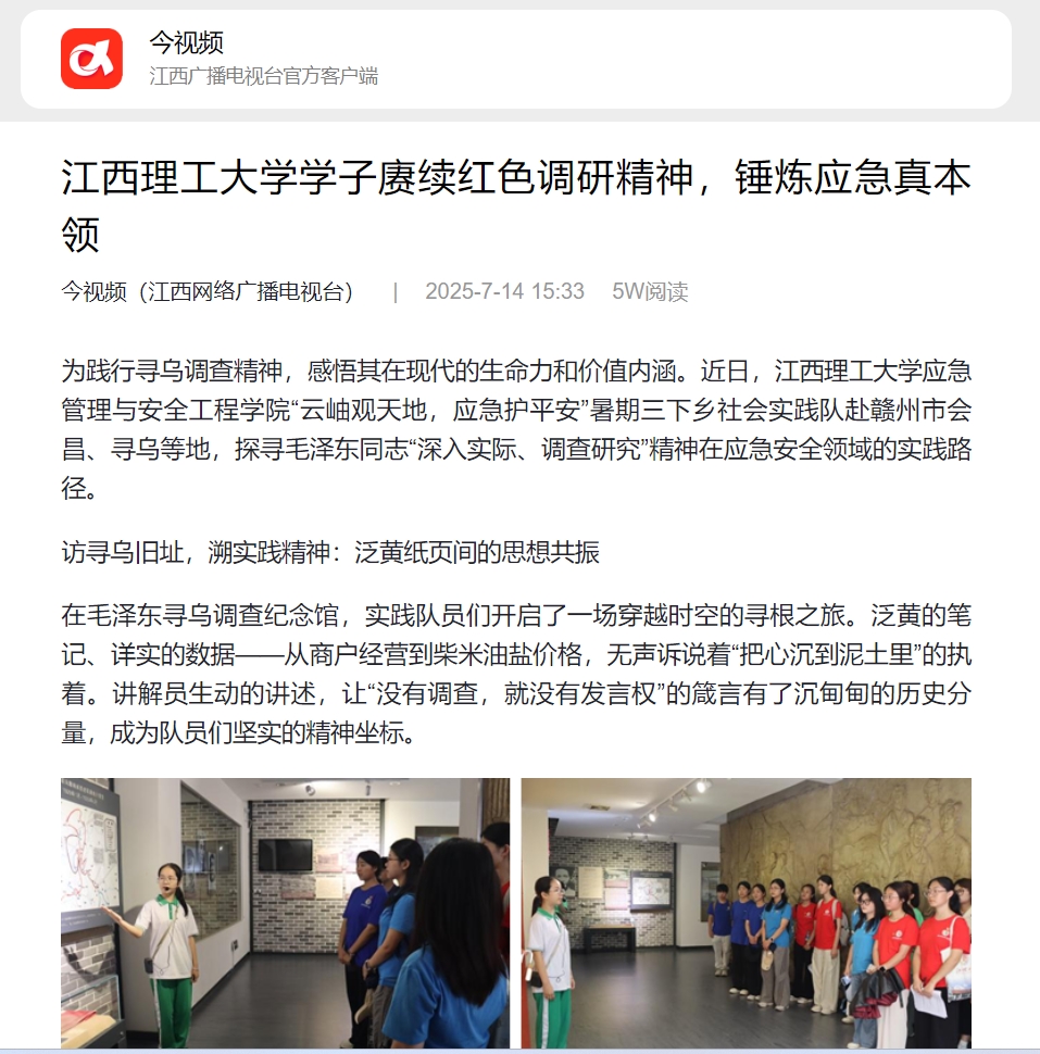 应急管理与安全工程学院“云岫观天地,应急护平安”暑期三下乡社会实践队赴赣州市会昌、寻乌等地,探寻毛泽东同志“深入实际、调查研究”精神在应急安全领域的实践路径。