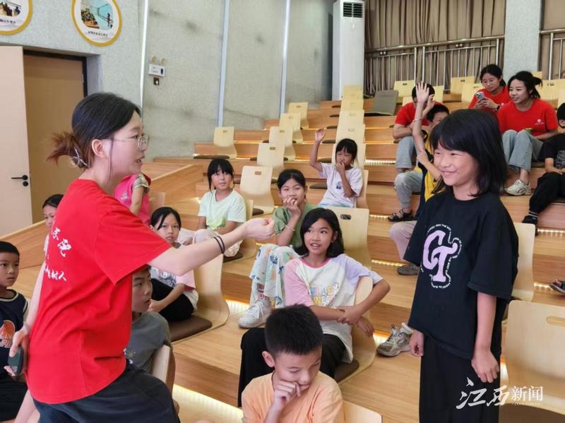 在游戏区域,童声笑语不断。“逛三园”游戏火热进行,孩子们争相报出“生态园”里的动植物名,不知不觉将上午生态课的知识融入游戏;“图书寻宝”活动中,小朋友们互相组队,并肩作战找到图书宝藏;篮球场上更是热火朝天,实践队员教孩子们投球技巧,大小身影穿梭跳跃,汗水浸湿了衣衫。