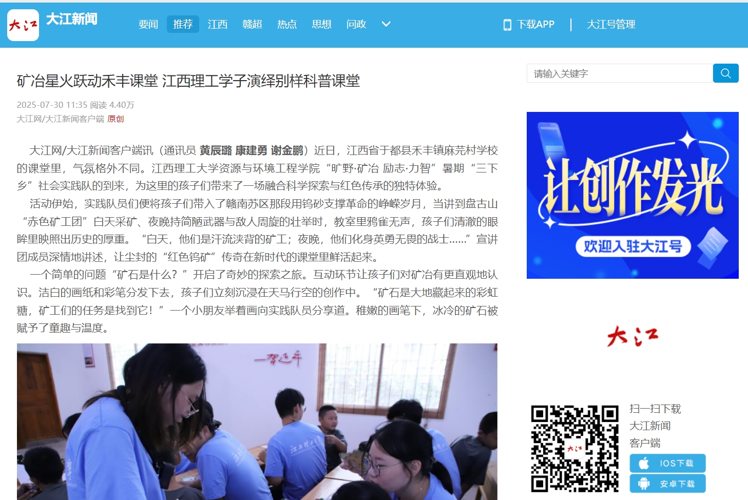 资源与环境工程学院“旷野·矿冶 励志·力智”暑期“三下乡”社会实践队的到来,为这里的孩子们带来了一场融合科学探索与红色传承的独特体验。
