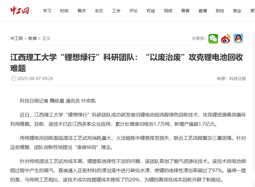 “锂想绿行”科研团队成功研发废旧锂电池短流程绿色回收技术,攻克锂资源高效循环利用难题。目前,该技术已在江西多家企业应用,累计处理废旧电池1.7万吨,新增产值超1.7亿元。