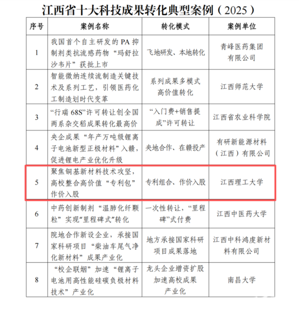紧密聚焦江西省加快推进制造业高质量发展、积极打造国家级先进制造业集群的战略部署,成果转化项目“聚焦铜基新材料技术攻坚,高校整合高价值‘专利包’作价入股”以专利组合为“金钥匙”、以作价入股为“新路径”,凭借对产业升级的显著推动作用及对成果转化模式的创新突破,于近日成功入选2025江西省十大科技成果转化典型案例,为高校服务地方产业发展树立了示范标杆。
