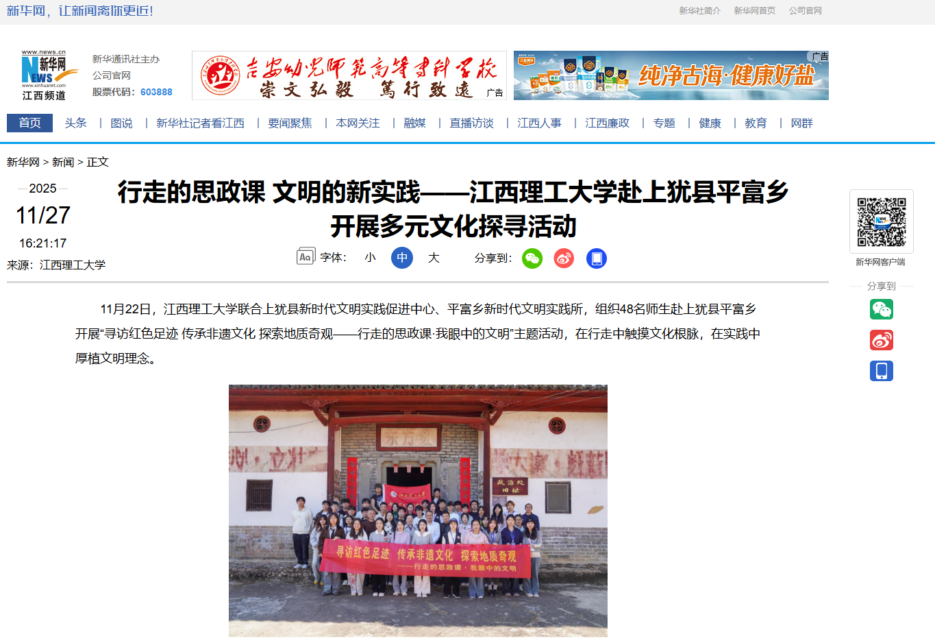 联合上犹县新时代文明实践促进中心、平富乡新时代文明实践所,组织48名师生赴上犹县平富乡开展“寻访红色足迹 传承非遗文化 探索地质奇观——行走的思政课·我眼中的文明”主题活动,在行走中触摸文化根脉,在实践中厚植文明理念。