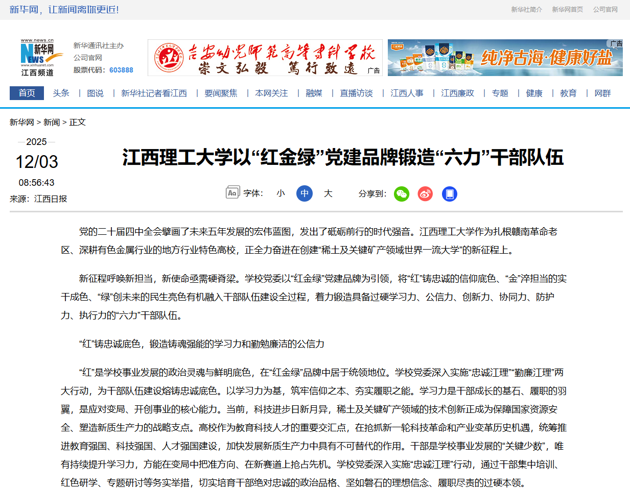 “红”是学校事业发展的政治灵魂与鲜明底色,在“红金绿”品牌中居于统领地位。学校党委深入实施“忠诚江理”“勤廉江理”两大行动,为干部队伍建设熔铸忠诚底色。以学习力为基,筑牢信仰之本、夯实履职之能。学习力是干部成长的基石、履职的羽翼,是应对变局、开创事业的核心能力。当前,科技进步日新月异,稀土及关键矿产领域的技术创新正成为保障国家资源安全、塑造新质生产力的战略支点。高校作为教育科技人才的重要交汇点,在抢抓新一轮科技革命和产业变革历史机遇,统筹推进教育强国、科技强国、人才强国建设,加快发展新质生产力中具有不可替代的作用。干部是学校事业发展的“关键少数”,唯有持续提升学习力,方能在变局中把准方向、在新赛道上抢占先机。学校党委深入实施“忠诚江理”行动,通过干部集中培训、红色研学、专题研讨等务实举措,切实培育干部绝对忠诚的政治品格、坚如磐石的理想信念、履职尽责的过硬本领。