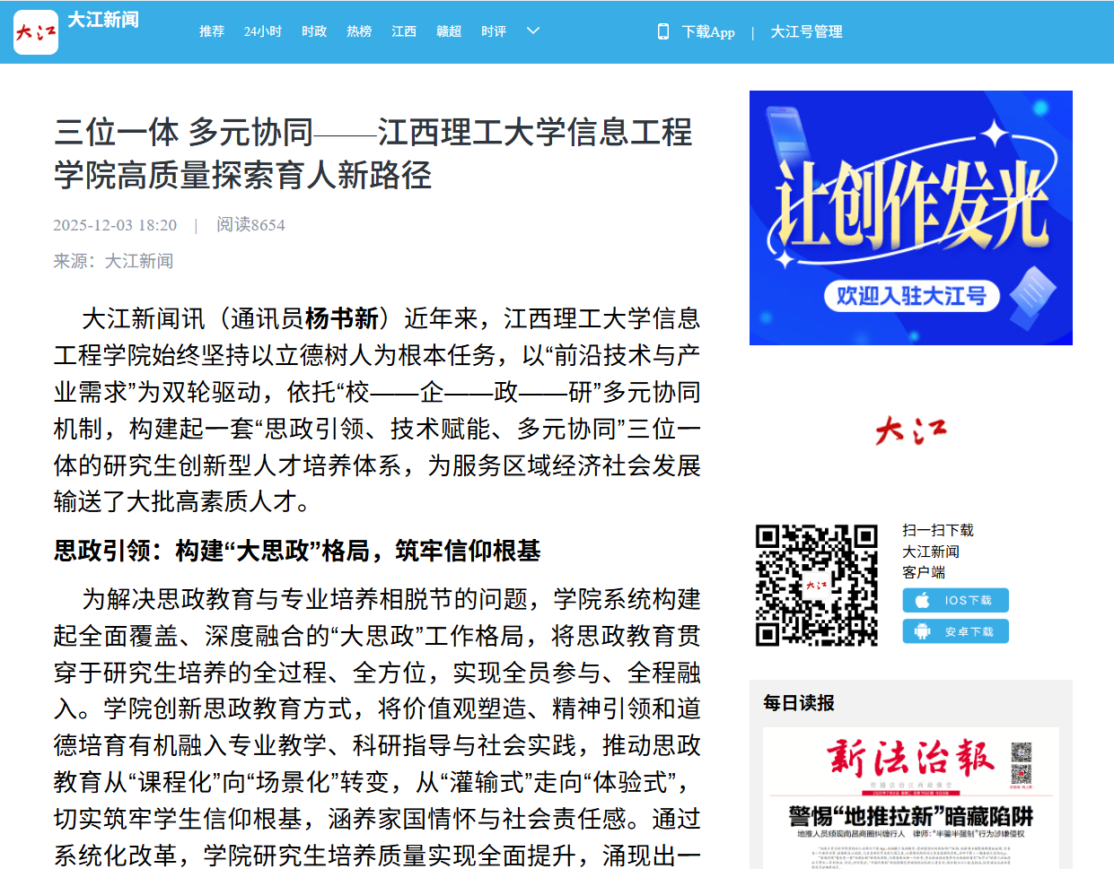信息工程学院始终坚持以立德树人为根本任务,以“前沿技术与产业需求”为双轮驱动,依托“校——企——政——研”多元协同机制,构建起一套“思政引领、技术赋能、多元协同”三位一体的研究生创新型人才培养体系,为服务区域经济社会发展输送了大批高素质人才。