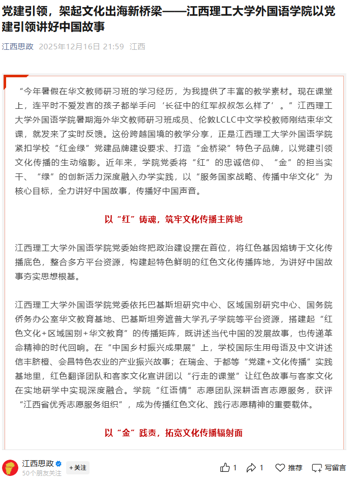 外国语学院党委依托巴基斯坦研究中心、区域国别研究中心、国务院侨务办公室华文教育基地、巴基斯坦旁遮普大学孔子学院等平台资源,搭建起“红色文化+区域国别+华文教育”的传播矩阵,既讲述当代中国的发展故事,也传递革命精神的时代回响。在“中国乡村振兴成果展”上,学校国际生用母语及中文讲述信丰脐橙、会昌特色农业的产业振兴故事;在瑞金、于都等“党建+文化传播”实践基地里,红色翻译团队和客家文化宣讲团以“行走的课堂”让红色故事与客家文化在实地研学中实现深度融合。学院“红语情”志愿团队深耕语言志愿服务,获评“江西省优秀志愿服务组织”,成为传播红色文化、践行志愿精神的重要载体。