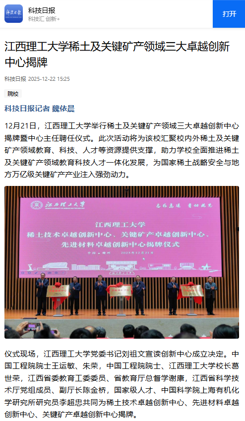 举行稀土及关键矿产领域三大卓越创新中心揭牌暨中心主任聘任仪式。此次活动将为该校汇聚校内外稀土及关键矿产领域教育、科技、人才等资源提供支撑,助力学校全面推进稀土及关键矿产领域教育科技人才一体化发展,为国家稀土战略安全与地方万亿级关键矿产产业注入强劲动力。