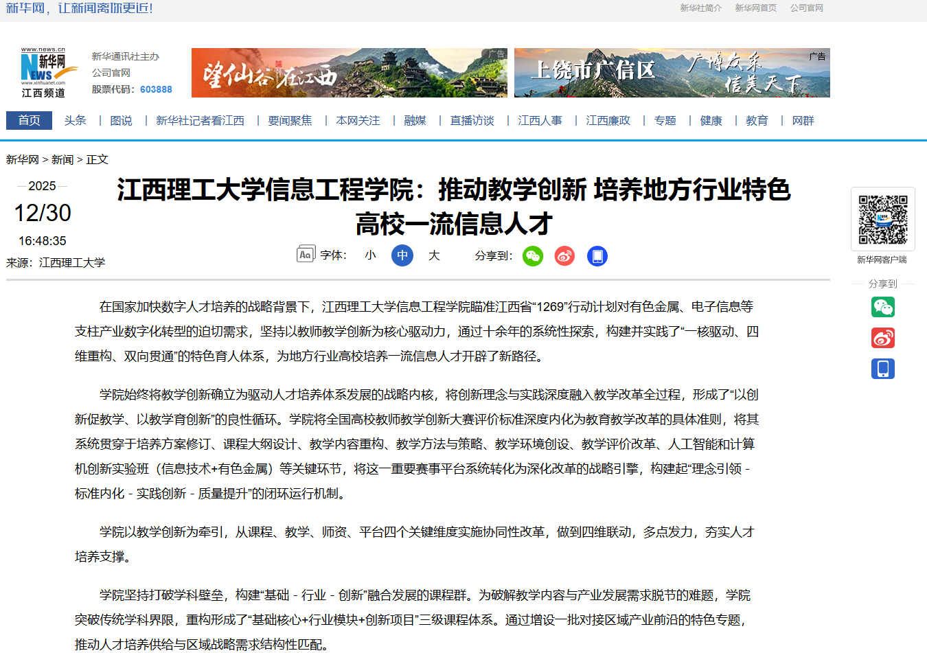 信息工程学院瞄准江西省“1269”行动计划对有色金属、电子信息等支柱产业数字化转型的迫切需求,坚持以教师教学创新为核心驱动力,通过十余年的系统性探索,构建并实践了“一核驱动、四维重构、双向贯通”的特色育人体系,为地方行业高校培养一流信息人才开辟了新路径。
