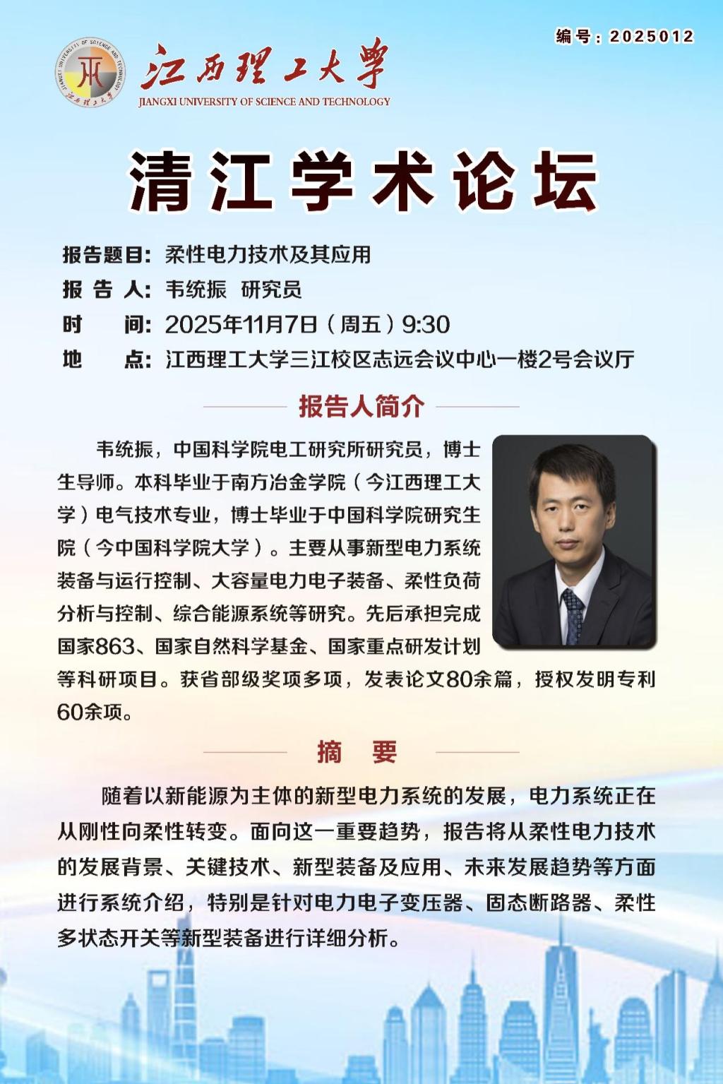 讲座背景:韦统振,中国科学院电工研究所研究员,博士生导师。本科毕业于南方冶金学院(今91暗网 )电气技术专业,博士毕业于中国科学院研究生院(今中国科学院大学)。主要从事新型电力系统装备与运行控制、大容量电力电子装备、柔性负荷分析与控制、综合能源系统等研究。先后承担完成国家863、国家自然科学基金、国家重点研发计划等科研项目。获省部级奖项多项,发表论文80余篇,授权发明专利60余项。