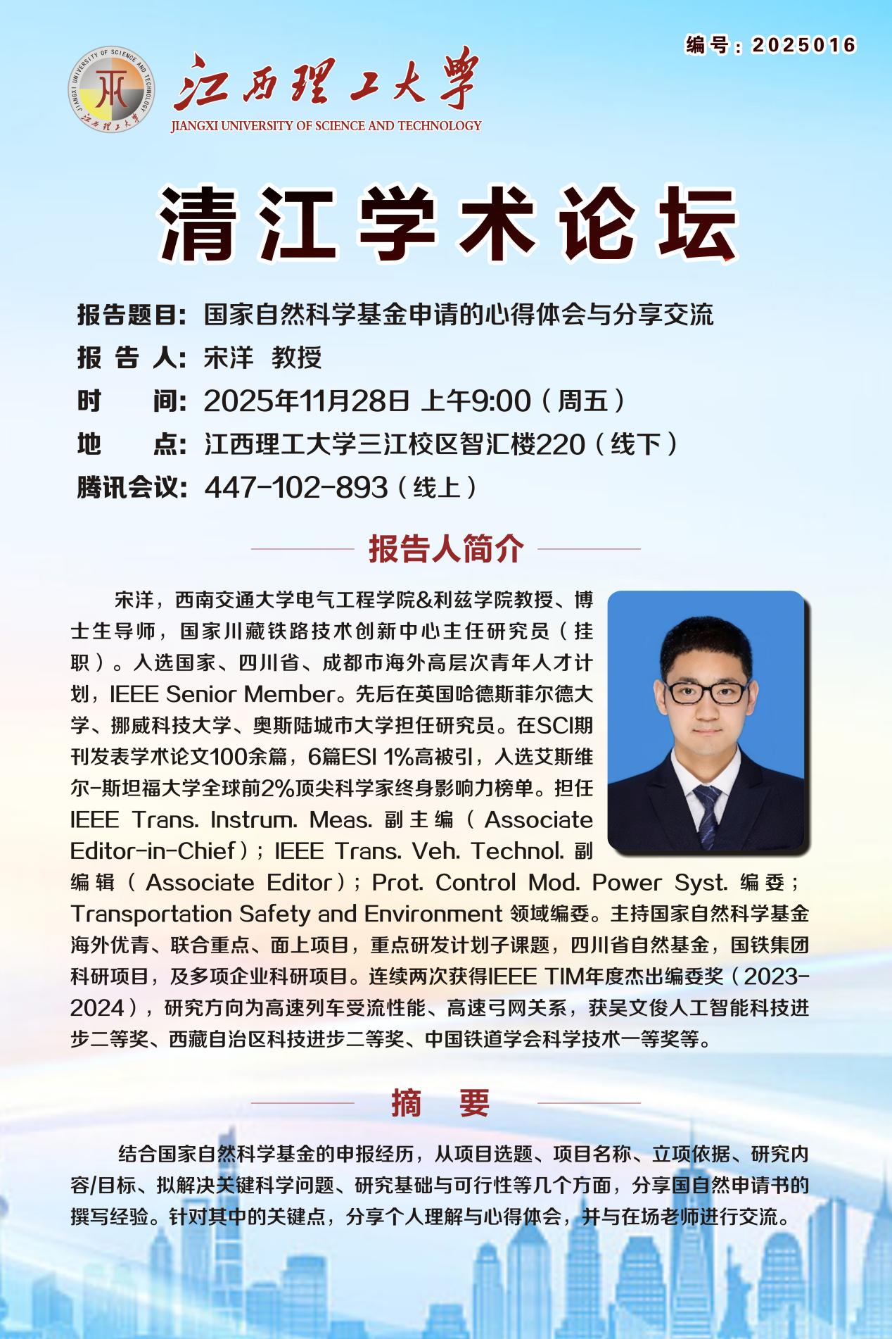 讲座背景:宋洋,西南交通大学电气工程学院&利兹学院教授、博士生导师,国家川藏铁路技术创新中心主任研究员(挂职)。入选国家、四川省、成都市海外高层次青年人才计划,IEEE Senior Member。先后在英国哈德斯菲尔德大学、挪威科技大学、奥斯陆城市大学担任研究员。在SCI期刊发表学术论文100余篇,6篇ESI1%高被引,人选艾斯维尔-斯坦福大学全球前2%顶尖科学家终身影响力榜单。担任IEEE Trans.Instrum.Meas.副主编( AssociateEditor-in-Chief);lEEE Trans.Veh. Technol. 副编辑(Associate Editor);Prot. Control Mod. Power Syst. 编查;Transportation Safety and Environment 领域编变。主持国家自然科学基金联合重点、面上项目,重点研发计划子课题,四川省自然基金,国铁集团科研项目,及多项企业科研项目。连续两次获得IEEETIM年度杰出编委奖(2023-2024),研究方向为高速列车受流性能、高速弓网关系,获吴文俊人工智能科技进步二等奖、西藏自治区科技进步二等奖、中国铁道学会科学技术一等奖等。