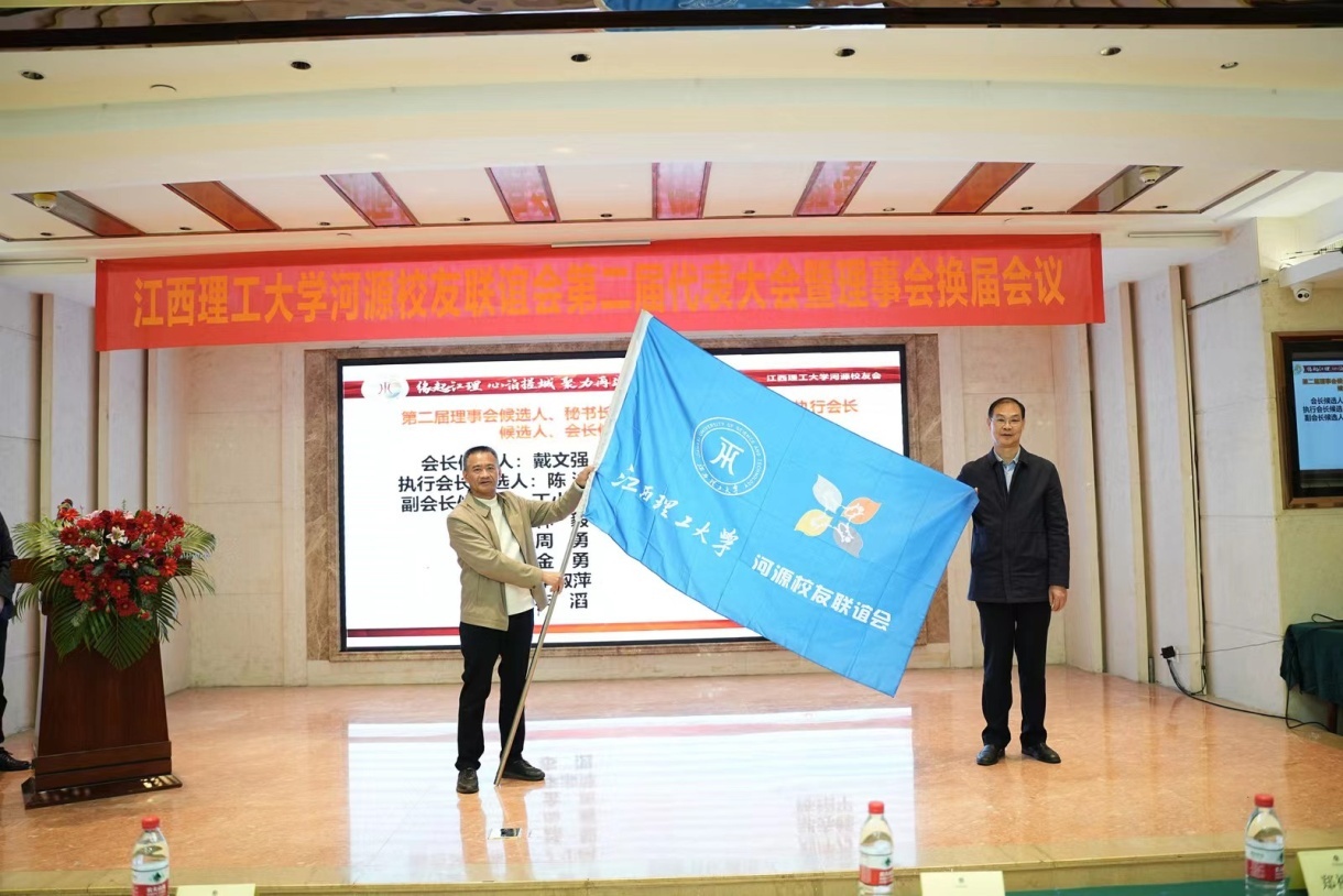 廖春发向会长颁发聘书、授旗,向新一届理事会的产生表示热烈的祝贺。他表示,新一届河源校友联谊会理事会的产生,标志着河源校友工作开启了新起点、新面貌、新使命,希望河源校友工作一要加温度,发挥桥梁纽带作用,持续加强沟通联系,用心用情服务好河源校友,共同建设好、维护好、发展好河源校友之家;二要深广度,充分搭建好、充实好平台功能,汇聚校友力量,牵线资源互补,为母校和校友发展提供更加坚实的助力;三要提高度,将校友工作与推动河源经济社会发展紧密结合起来,为国家建设、地方经济社会发展贡献出江理智慧与力量。最后,廖春发向广大校友发出了“请校友回母校”的邀请。