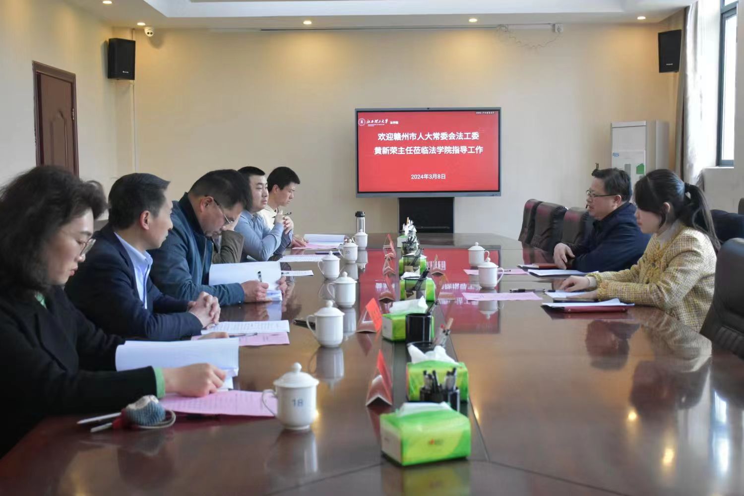 本网讯 近日,赣州市人大常委会法工委主任黄新荣莅临赣州地方立法研究基地指导工作。法学院院长项波、副院长孟春阳及学院相关教师参加座谈,会议由法学院副院长张奇主持。