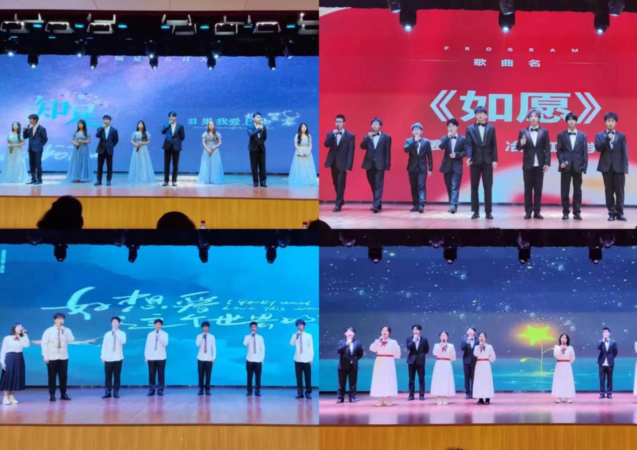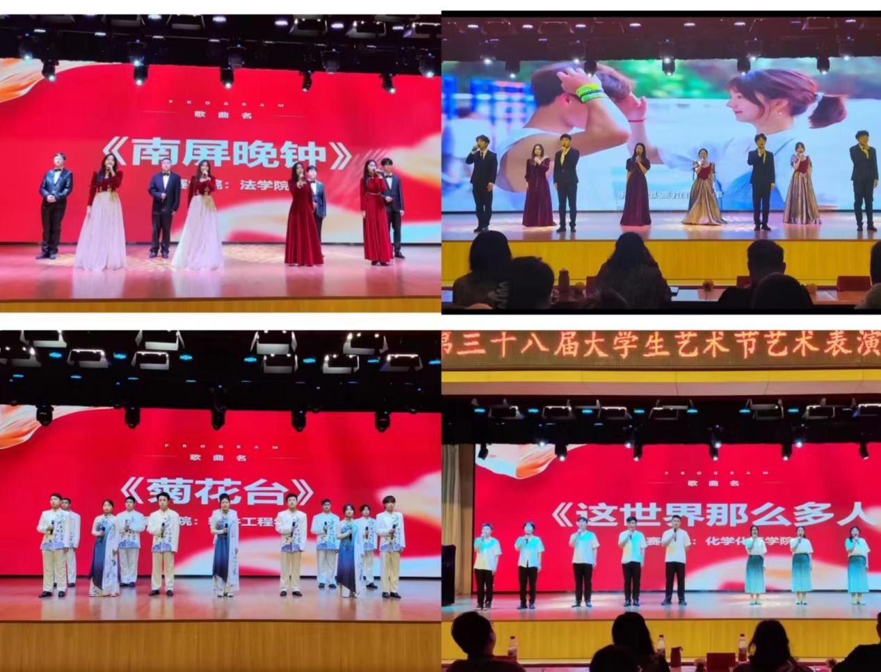 随后,音乐伴奏组15支队伍也各展所长,深情的演奏、美妙的歌喉、生动贴合的舞蹈、为观众带来了一场极具震撼力和感染力的视听盛宴。首先,软件工程学院代表队演唱的《菊花台》以深沉婉转的曲调营造出一种哀而不伤的氛围,表达了对国家的忠诚,引人悲怜;理学院代表队的《紫荆花盛开》用含蓄而温暖的词曲为祖国过献上祝福,传递着对祖国的热爱和美好期待;材料科学与工程学院代表队以一首《上春山》将观众的思绪带上春山,描绘了一幅生机盎然的春山画卷;电气工程与自动化学院代表队的《好想爱这个世界啊》展现了对抑郁症群体的理解与关怀,传递着希望与温暖;机电工程学院代表队的《像你这样的朋友》,唤醒了观众内心深处关于青春和梦想的回忆;化学化工学院代表队与体育与艺术学院代表队的《这世界那么多人》表达了爱而不得的心酸与遗憾和对逝去爱情的缅怀与感谢;艺术团声歌队的《我歌唱的理由有很多》欢愉轻快的歌声表达了对生活的热爱;稀土学院代表队的《我记得》表达了对爱情和未来乐观的态度,以及一种不断前行、不断挑战自我的有一种精神;信息工程学院代表队带来的《彩虹》简单直白的词曲表达了对爱情的追求,既象征着希望又承载回忆;应急管理与安全工程学院代表队的《从前慢》以完美的表现的动了现场观众;冶金工程学院代表队的《如愿》传递着对生活的美好期待;资源与环境工程学院代表队的《知足》表达了对生活的满足和感激之情;土木与测绘工程学院代表队的《奉献》唤醒了观众内心深处对奋斗、奉献和勇气的追求;最后,由法学院代表队带来的《南屏晚钟》已婉转动人的歌声描绘了一段情人间相思相恋的动人故事,并为本次比赛画上圆满的句号。